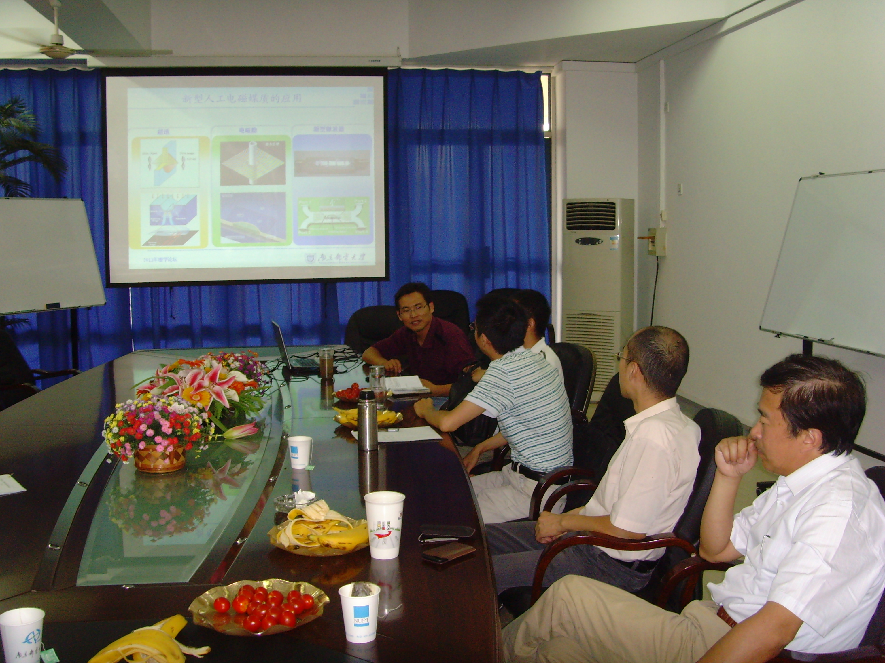 王正斌博士在报告中首先建立了以串联非线性电容为基础的二维非线性左手传输线模型,分析这种非线性人工电磁媒质的色散关系和传播特性,介绍二维非线性左手传输线人工电磁媒质的设计和实现方法,分析不同泵浦源功率下的非线性效应,以及基波、二次谐波、三次谐波的传播特性。然后,通过二维非线性左手传输线人工电磁媒质实现近场聚焦和超透镜平板成像,介绍了非线性左手传输线媒质和右手传输线媒质在谐频匹配的设计方法。另外,介绍了设计非线性左手传输线平板透镜,其对源的基频波不透明,却能够通过谐频场实现亚波长成像。最后参加活动的老师就相关的一些问题进行了讨论。
