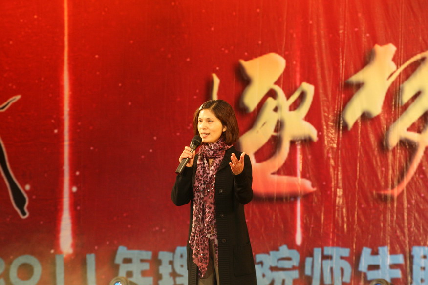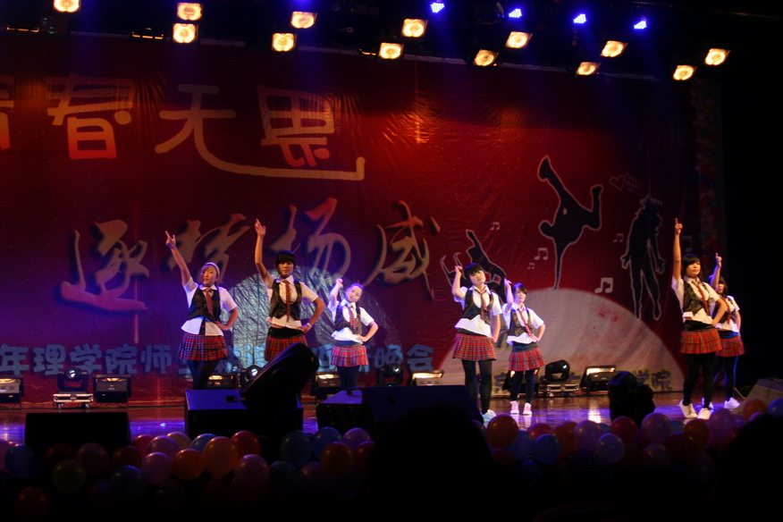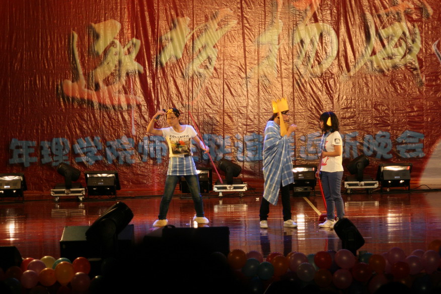 在工作人员的精心布置下,晚会现场到处都弥漫着欢乐的气氛。晚会在大学生艺术团电声乐队激昂的电子乐中拉开帷幕,现场气氛一下子被带动起来。随后,小品《武大郎告状》中的反串引发阵阵笑声,青春活力的舞蹈《爱你》彰显了大一新生蓬勃的朝气,喝彩连连。郑莹老师倾情献唱一曲《蝴蝶泉边》将晚会推向一个小高潮,同学们纷纷上台给老师献花并在人人网状态墙为郑莹老师加油。中间的互动游戏,真正的达到了全场一起互动的目的,20名观众参与了游戏,此时的青春剧场浸在一片欢声笑语当中。动感的节奏,帅气的动作,858街舞社将晚会推向了另一个小高潮。《新还珠格格》中的容嬷嬷集万千宠爱与一身,“你还记得大明湖畔的夏雨荷吗?”成了经典。在众多粉丝的期待下,晚会的压轴——蒋志芳老师缓缓登场,蒋老师一曲《绣红旗》赢得掌声无数,将晚会推向了高潮,晚会在优美的旋律落下帷幕,最后,嘉宾上台与工作人员合影,记录下这一美妙的时刻。在节目之余,这次晚会也增添了另一个互动活动,就是人人网状态墙,观众自由的评论发状态,甚是激烈,同时也收到了很多兄弟院系和社团发来的贺电,成为了本场晚会一道别样的风景线。