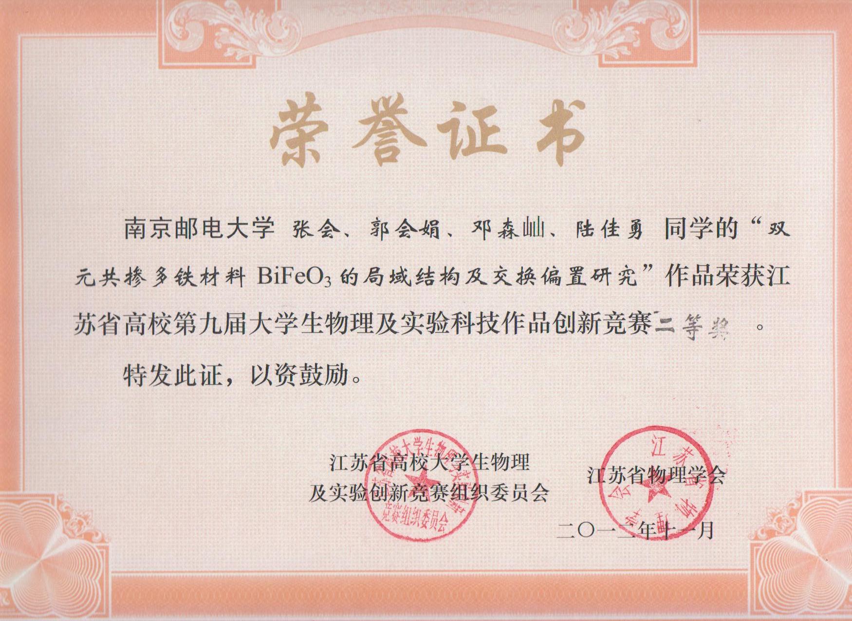 yl6809永利皇宫应用物理专业张会、郭会娟、邓森屾等同学的学术论文《双元共掺多铁材料BiFeO3局域结构及交换偏置研究》获得二等奖。这也是yl6809永利皇宫物理实验创新基地成立以来的又一成果。另外,yl6809永利皇宫