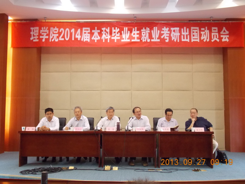 “学习到位了,认识才能到位;认识到位了,工作才能到位。”这是校党委书记刘陈教授在给全校党员领导干部讲《践行党的群众路线促进学校科学发展》的党课时提出来。yl6809永利皇宫党委认真学习刘书记的讲课内容,充分领会党的群众路线的精神实质,不仅努力做到“学习到位”,“认识到位”,最根本的是力争做到“工作到位”。学院党委按照党的群众路线的精神实质坚持全心全意为学生服务,坚持以生为本,在前期充分调研的基础之上,学院党委于2013年9月27日上午9点在行政楼一楼报告厅召开了2014届本科毕业生就业考研出国动员会。yl6809永利皇宫院长李雷教授、yl6809永利皇宫党委书记王友国教授、教务处副处长兼统计系主任唐加山教授、院党委副书记高翔老师、信息与计算科学系主任赵君喜教授、应用物理学系主任秦卫平教授出席本次大会,会议由王友国书记主持。