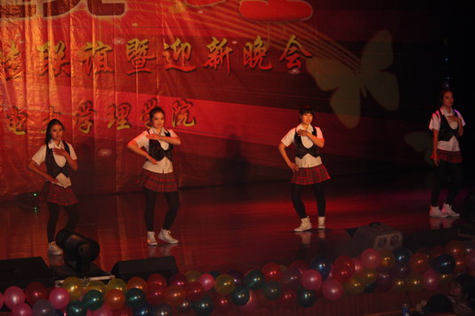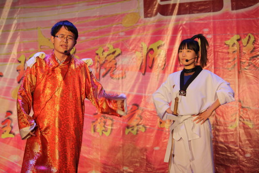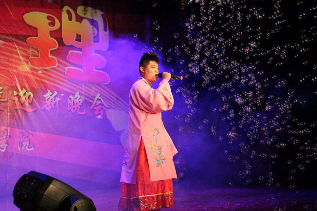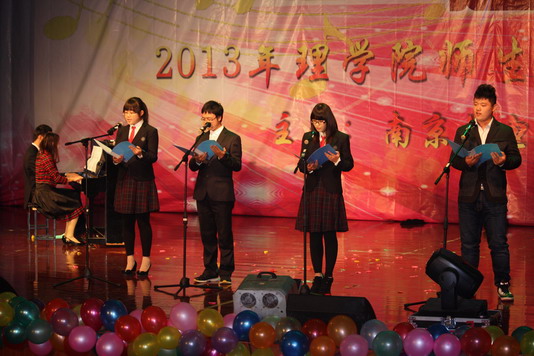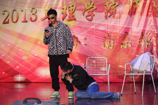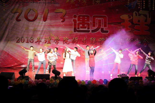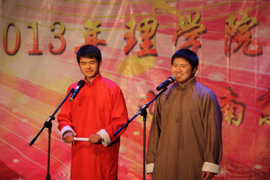 灯闪乐鸣,晚会在大艺团动听而美妙的开场秀《克罗地亚狂想曲》中拉开帷幕,大一新生的舞蹈《不要不要》展示了青春的活力与朝气,研究生表演的话剧《新西厢记》大胆地把现代元素融合于表演中,彰显了理院学子的独特风采,让观众笑得前仰后翻,马驰野同学反串的《新贵妃醉酒》使人眼前一亮,宋洪雪老师参与演出的话剧《校园新闻》更是赢得观众的阵阵掌声,紧随其后的相声《考场遐想》诙谐幽默地再现了校园生活,辅导员黄洁老师在舞蹈《小小时代》中与学生干部一起大秀舞技,引得台下学生惊叫连连,将晚会推向一个小高潮。晚会下半场,充满青春活力的舞蹈《no no no》再现了大二学生的激情,四手联弹钢琴曲《天空之城》配乐诗朗诵《世界上最远的距离》在王兰宁老师一句“我认为世界上最远的距离不是天涯与海角,而是我在上数分课而讲台下的同学在看高等代数!”赢得全场爆笑,搞怪话剧《大明湖畔的容嬷嬷》、《皇后与秋香》、858街舞社爵士舞等节目也是毫不逊色,在观众的一片期待声中高翔、李伯虎、胡国宝等三位老师一曲慷慨激昂的《真心英雄》点燃了所有人的激情,全场观众跟着一起唱起来。