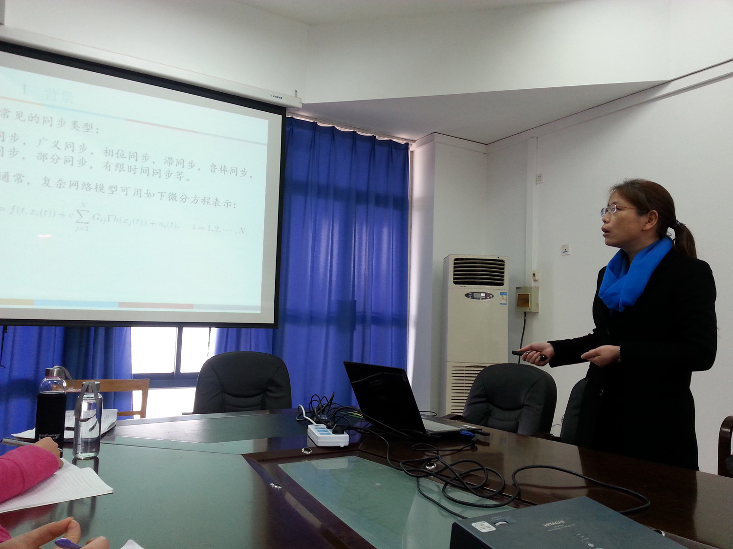 郑聪博士分别从网络同步的背景、意义、框架、方法等对网络同步的内容进行了叙述,对一类奇异混杂耦合网络的有限时间的同步控制问题进行了详细介绍。郑博士的报告内容翔实,深入浅出。报告会后,郑博士和与会师生就网络同步的应用以及有关的学术问题进行了有益的交流和探讨。