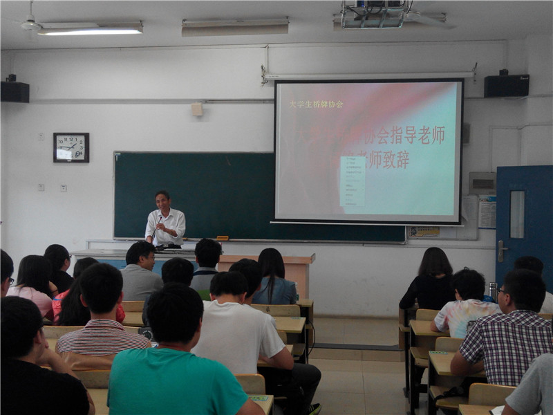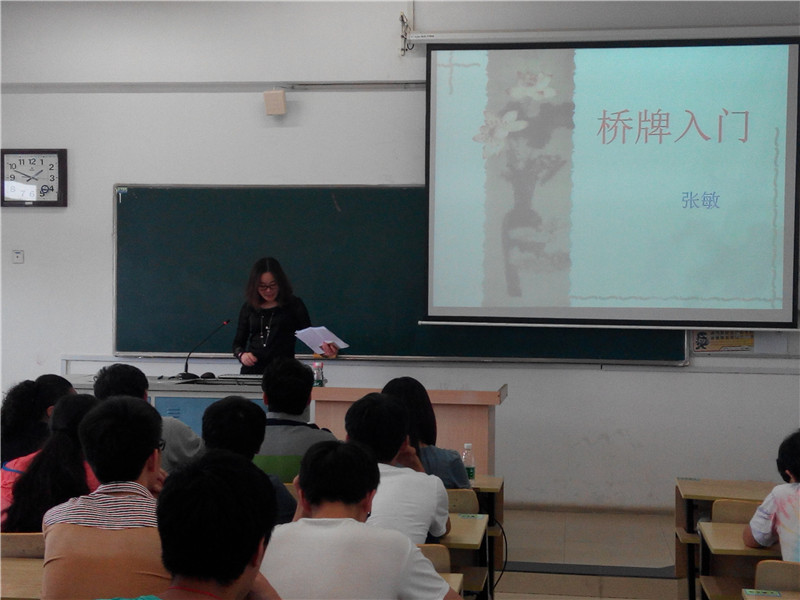 校大学生桥牌协会指导老师何铭为协会成立致辞,何老师通过自身打桥牌经历表达对桥牌的高度热爱并对大学生桥牌协会的发展提出了殷切的希望。接着,江苏省桥牌女队队员张敏给大家作了《桥牌入门》讲座,张敏老师给大家展示了许多国内外桥牌比赛的图片,增强了大家对桥牌的兴趣,然后张老师又给大家介绍了桥牌的规则,通过一些幽默风趣、通俗易懂的语言组织,以及在黑板上的图形展示,大家很快就学会了打桥牌的一些基本知识。简单的成立仪式结束后,大家移步教2-306观摩了雍正生教授为大家准备的表演赛,大家都为雍教授精湛的牌艺和极高的人生修养惊叹和折服。