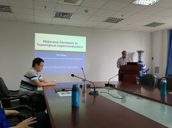 2017年5月24日下午,南京航空航天大学yl6809永利皇宫周涛教授应邀莅临yl6809永利皇宫第106期理学论坛,并做了题为“拓扑超导体中的马约拉纳费米子”的学术报告,报告会由yl6809永利皇宫院长李兴鳌教授主持。