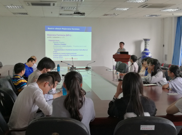 周涛教授的报告由马约拉纳费米子的基本物理概念开始,并介绍了其在基础研究领域重要的研究价值以及在拓扑量子计算方面有着潜在的应用。随后,周教授报告了课题组近年来在各类拓扑超导系统中可能的马拉约那费米子激发,包括简谐势、带电杂质诱导的马拉约那费米子激发等。此外,拓扑量子态的概念由绝缘体,超导体等有能隙的系统延伸到无能隙的金属系统,周教授还介绍了课题组对外尔超导体的一些研究成果,包括基态,拓扑性质,马拉约那费米子激发等。在报告中,与会师生同周教授进行了有效的互动,就相关问题进行了深入的交流和讨论。