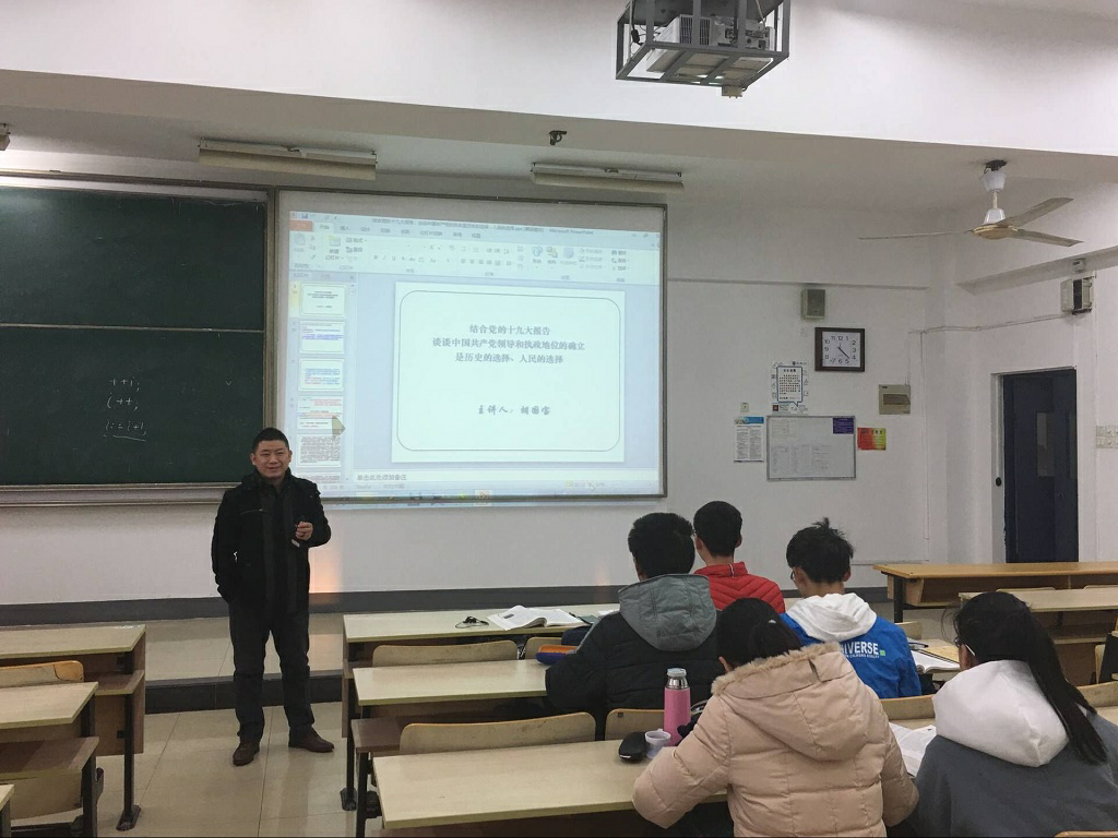 胡国宝老师以“结合党的十九大报告,谈谈中国共产党领导和执政地位的确立是历史的选择、人民的选择”为题对学生学习领会十九大精神进行辅导。胡老师主要结合中国近现代史以及党的性质和宗旨两个角度来向大家阐释党的领导和执政地位的确立原因:重点是结合党的十九大报告的内容向大家阐明党的领导和执政地位的确立是历史的选择和人民的选择。胡老师详细向我们解读了中国共产党人的初心和使命,以及十九大报告中提出的过去五年我们取得的十个方面的历史成就,特别结合十九大报告中坚持全面从严治党来向同学们阐明党的领导和执政地位确立的必然性。