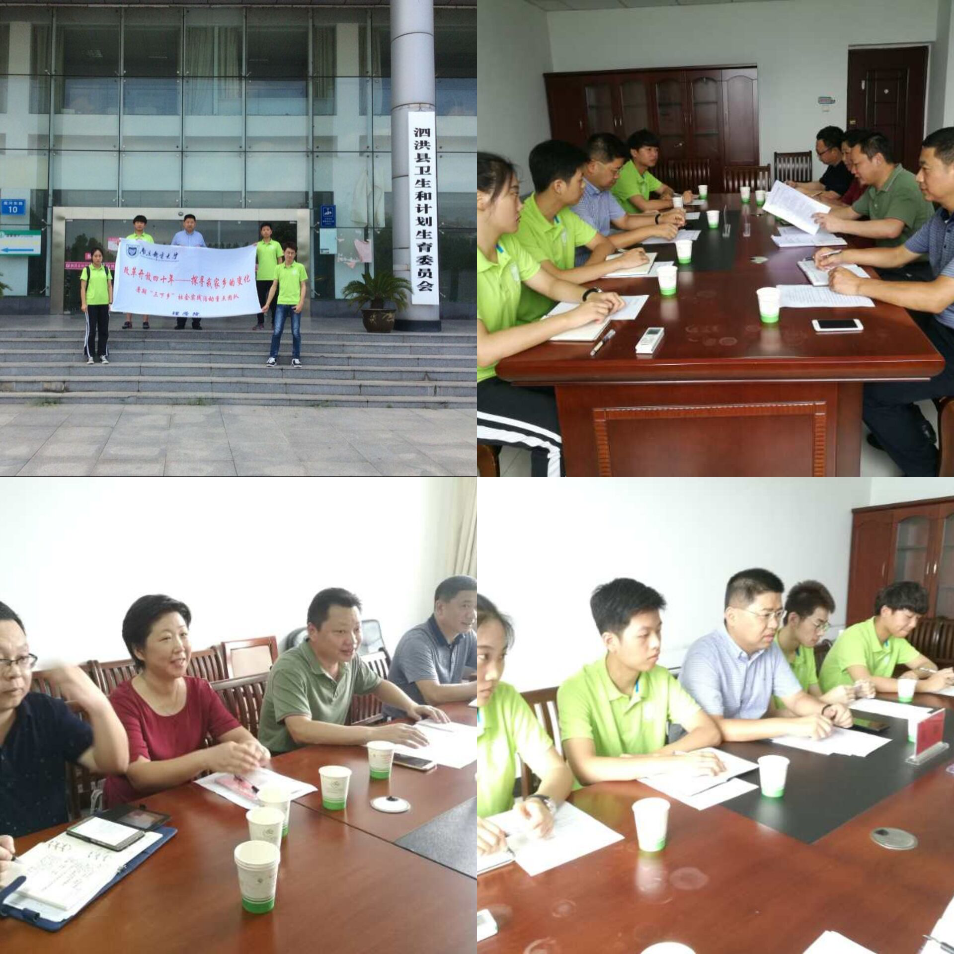 在高翔书记的带领下,实践团队首先来到泗洪县卫生和计划生育委员会,受到了石辉副主任等热烈欢迎,他们结合20余年的工作经历向团队成员们讲述了泗洪的人口发展情况。80年代实施的计划生育政策有效控制了人口的增长,使得泗洪的人口出生率逐渐降低,缓解了人口对资源、环境的压力;时代在进步的同时政策也在变化,如今泗洪卫计委深入贯彻实施国家的开放二胎政策是缓解人口老龄化问题最有效的举措。四十年来,政府部门切实制定了多项政策帮助提升人力资源,支持鼓励青年创业,带动了泗洪的经济增长。四十年的改革开放让泗洪地区把握好机遇,稳步求发展。