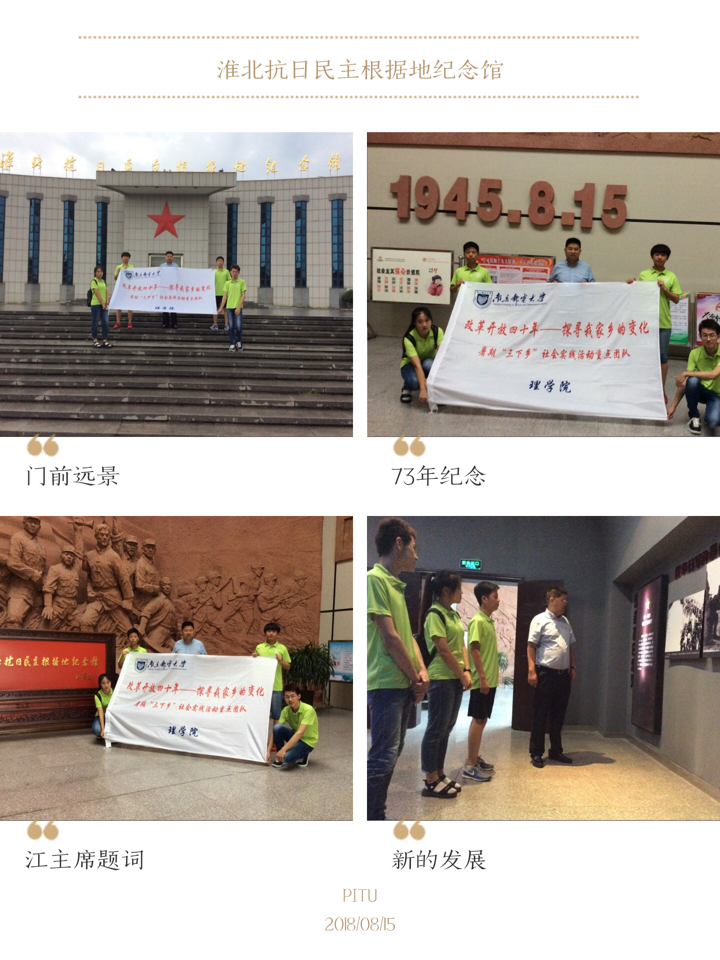 8月15日,时值日本战败投降73周年纪念,天色灰蒙,庄严肃穆,实践团队首先来到了淮北抗日民主根据地纪念馆,瞻仰革命先烈。八年抗战,风雨飘摇,纪念馆内当年在这片土地上抛头颅洒热血的烈士们的英勇事迹触动人心,是他们带来今天这片土地的安静与祥和。牢记历史,珍爱未来,随着新中国成立,改革开放的进一步发展,我们在这片先烈们鲜血染红的土地上越走越远,带着历史的厚重感与民族的责任感,我们砥砺前行。