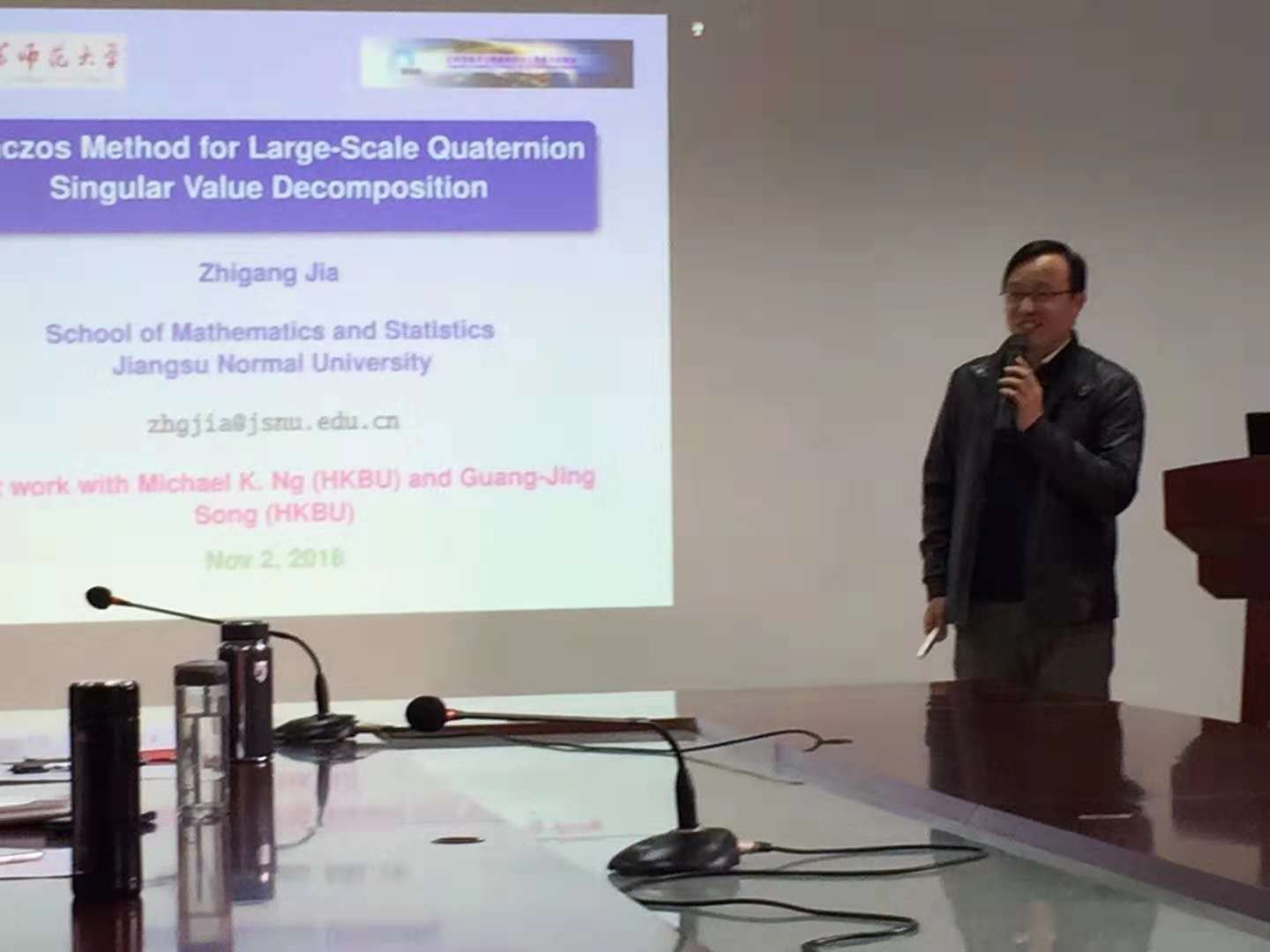贾志刚博士现为江苏师范大学教授、硕士生导师、第一批高层次人才队伍后备人选。主要研究方向为数值代数与图像处理,至今已在 SIAM J. Matrix Anal. Appl., J. Sci. Comput., BIT, J. Comput. Appl. Math.等国际知名期刊上发表学术论文20余篇,主持、参与国家自然科学基金项目3项和省部级科研项目3项。贾教授的报告题目为:Lanczos Method for Large-Scale Quaternion Singular Value Decomposition,在报告中,贾教授提出了大规模四元数矩阵奇异值分解的Lanczos方法,及其在彩色图像和视频低秩逼近中的应用,并和听众分享了未来可研究的若干问题。