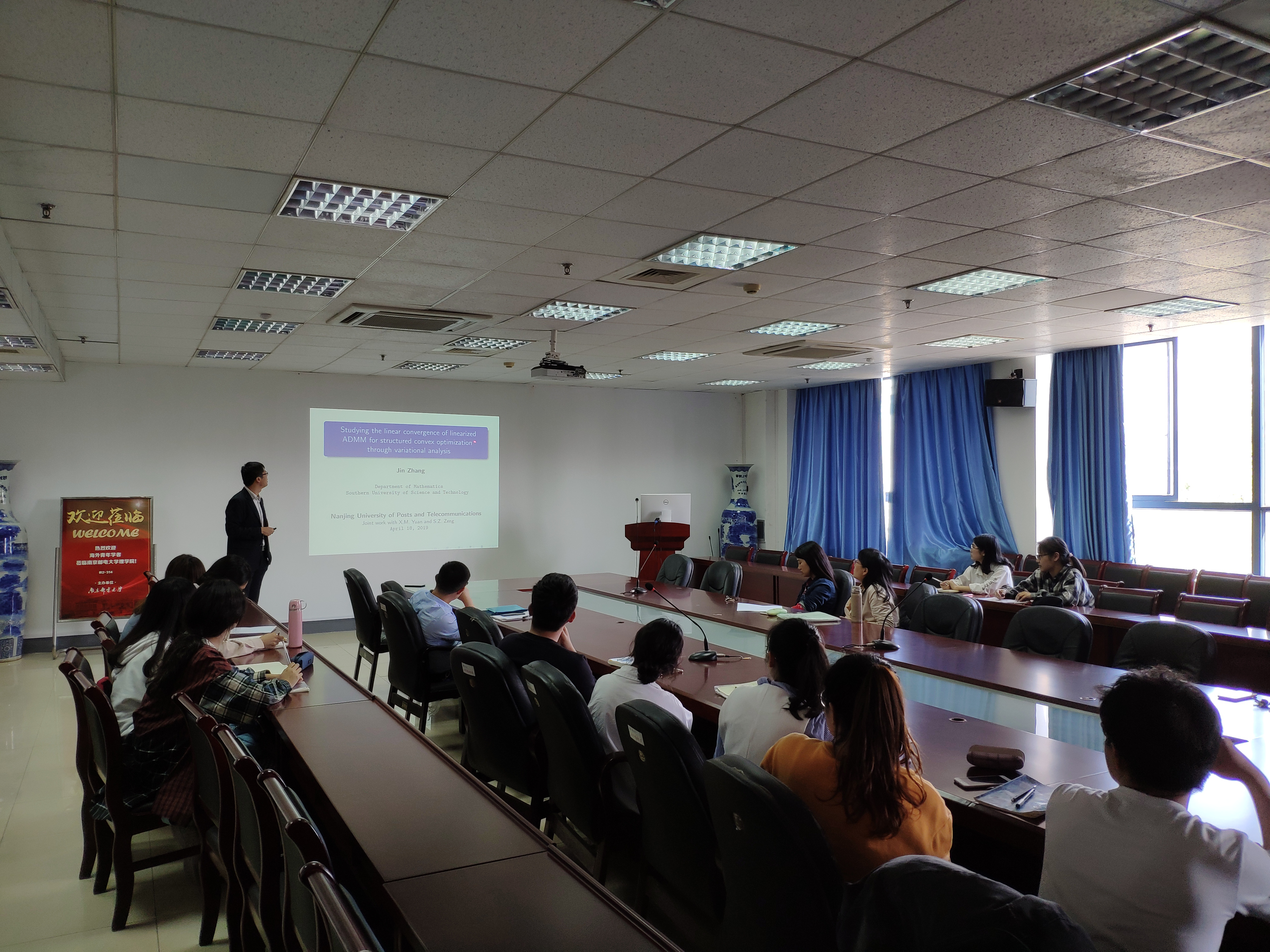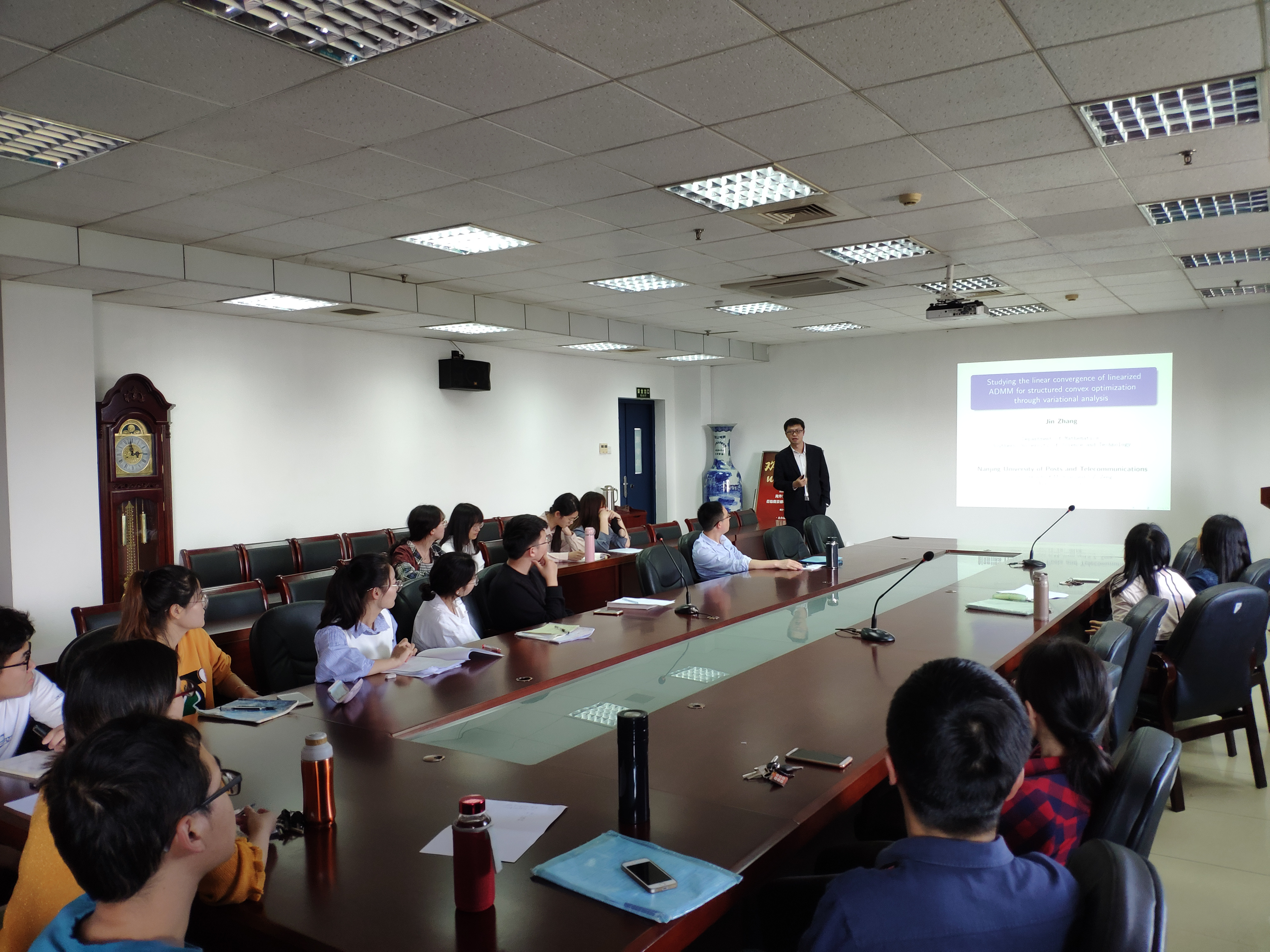 张进教授报告题目为“Studying the linear convergence of ADMM for structured convex optimization via variational analysis”。张博士的报告系统地介绍了ADMM 算法的线性收敛率问题以及研究该问题的各种方法。在最近的研究中,张进博士课题组通过运用变分分析方法,给出了ADMM算法线性收敛率的一个精确刻画。