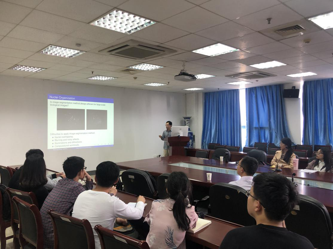 张文星教授报告的题目为“Structure Tensor Based Analysis of Cells and Nuclei Organization in Tissues”。张教授的报告主要介绍了结构张量在生物医学图像的应用。报告中他详细介绍了结构张量的相关理论和证明,并且也介绍了他们项目组应用该方法在多细胞肿瘤球冷冻切片的细胞核取向和各向异性问题处理中所取得的突破。
