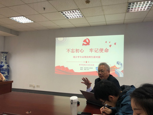 2019年11月8日下午12时30分,yl6809永利皇宫统计学系党支部在教2-314会议室召开了:“不忘初心、牢记使命”主题教育--统计学专业帮扶师生面对面座谈会。校党委组织部部长王友国教授,yl6809永利皇宫党委书记温勇教授,yl6809永利皇宫副院长兼统计学系主任唐加山教授,统计学系党支部全体党员教师,应用统计专业硕士生导师以及应用统计学专业学生代表参加了本次座谈会。座谈会由统计学系党支部书记武婷婷同志主持。