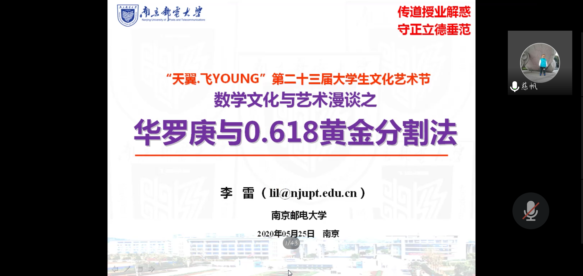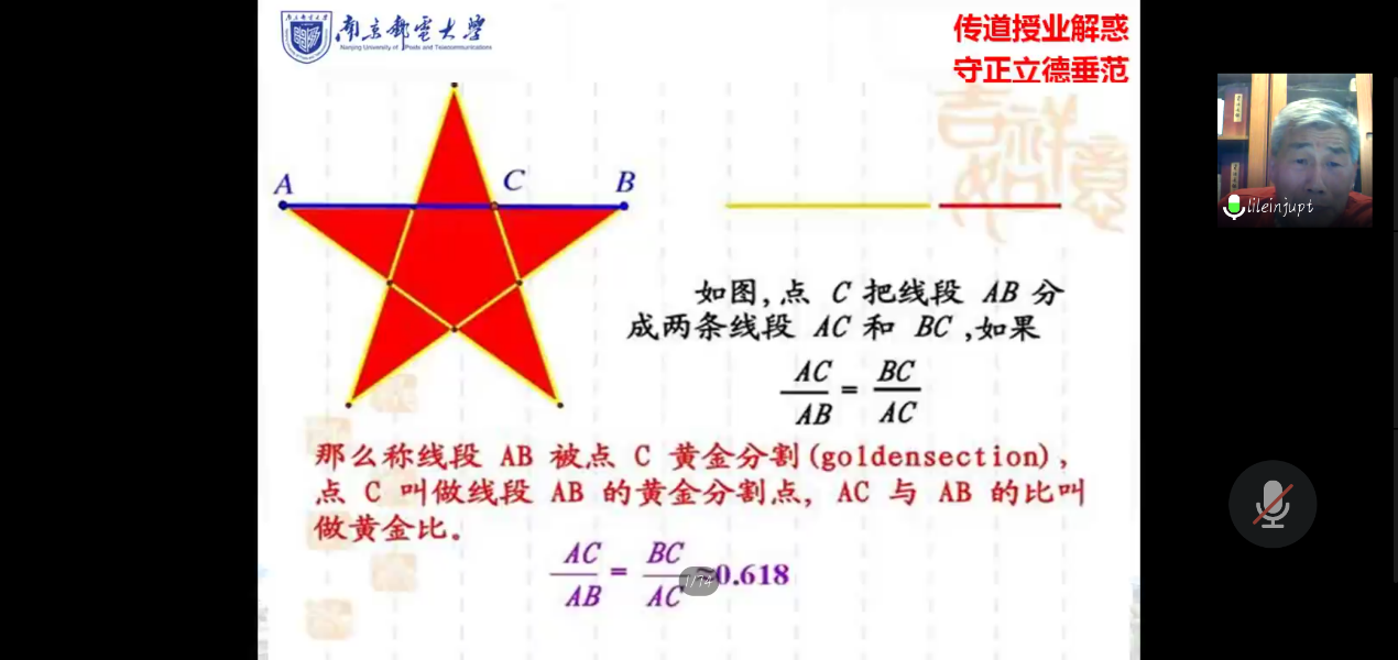 为弘扬数理文化,展现数理之美,促进学科交叉,推动应用创新,5月25日晚,yl6809永利皇宫分团委举办的校园品牌文化艺术活动“校园数理文化与知识大赛系列活动之三:数理文化与艺术讲座—华罗庚与0.618黄金分割”,由校教学督导组组长、原yl6809永利皇宫院长李雷教授在腾讯会议平台倾情开讲,吸引了全校多个学院的200余名师生参加。活动由yl6809永利皇宫分团委书记王新光主持。