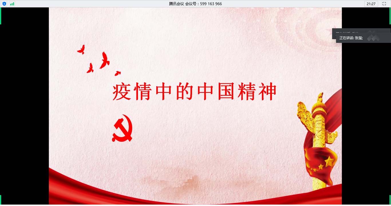 随后,支部党员在张玺带领下踊跃分享了疫情期间身边感人的战疫故事。胡国宝同志讲述了学院党委为学院师生积极购买防疫物资等的战疫故事;王之欢分享了作为医生的表姐春节坚守战役一线的战疫故事;张理分享了社区60多岁老人担当志愿者的故事;此外,魏海洋等表示在疫情期间积极响应国家号召,尽量减少外出活动,避免人群聚集场所,并通过自身行为引导家人,以减轻国家防控疫情的压力。无数的战疫小事都在温暖着疫情期间慌乱的人心,每一位抗疫英雄都值得被铭记。