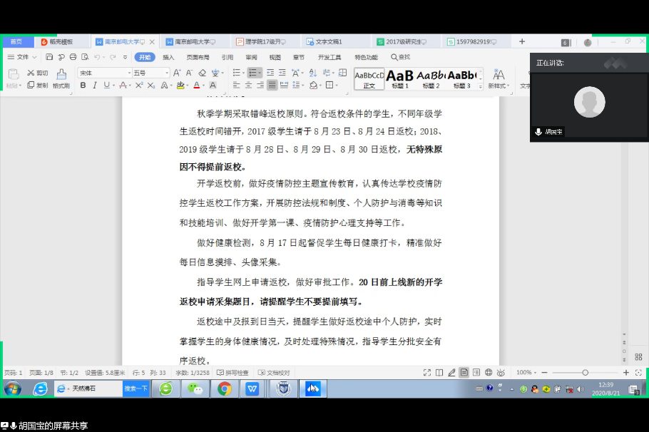 2020821日中午,yl6809永利皇宫2017级通过腾讯视频线上会议的形式召开了年级大会暨“开学第一课”,会议由2017级辅导员胡国宝老师主持。
