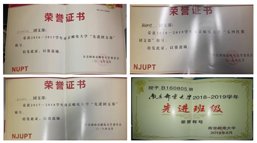 B160805班六级通过率为61.3%,曾先后获得院级争做“六有”大学生团日活动“先进团支部”、2016-2017学年校级“先进团支部”、2017-2018学年校级“先进团支部”、2018-2019学年校级“五四红旗团支部”和校级“优秀班集体”的荣誉。