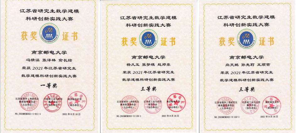 8月15日, 2021年江苏省研究生数学建模科研创新实践大赛(下简称大赛)获奖名单公布,yl6809永利皇宫师生在本次竞赛中获得优异成绩,冯婧涵同学带队的组获一等奖,杨久玉同学以及尚天鹏同学带队的组均获三等奖,孔告化老师获评大赛优秀指导教师。