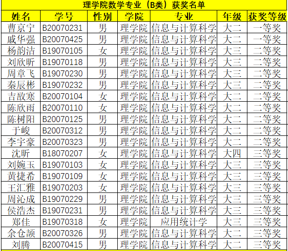 今年是yl6809永利皇宫学生第三次参加全国大学生数学竞赛,其中信息与计算科学专业42名同学和应用统计学专业一名同学报考数学专业(B类),应用统计学专业15名同学报考非数学专业类。优异成绩的取得,离不开同学们的勤奋学习和努力拼搏,离不开蒋志芳、严珍珍、王兰宁、应志领等老师的鼓励和指导,也是学校和yl6809永利皇宫高度重视提升数学类课程教学质量的必然结果。
