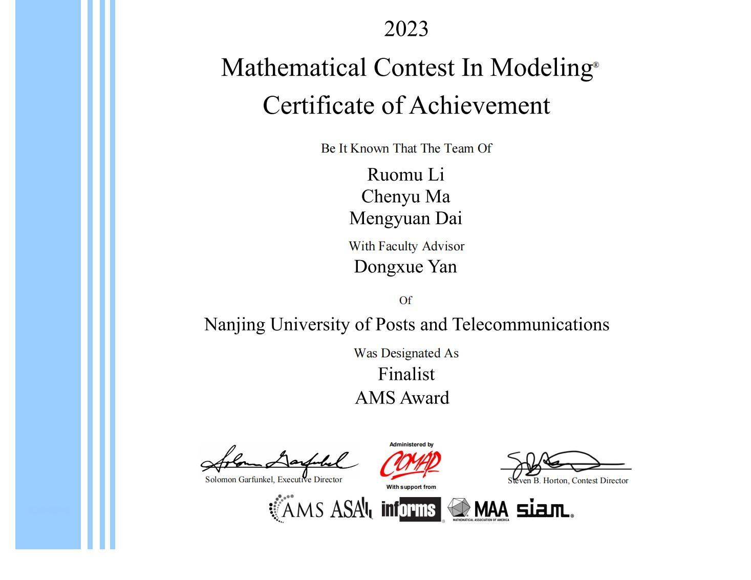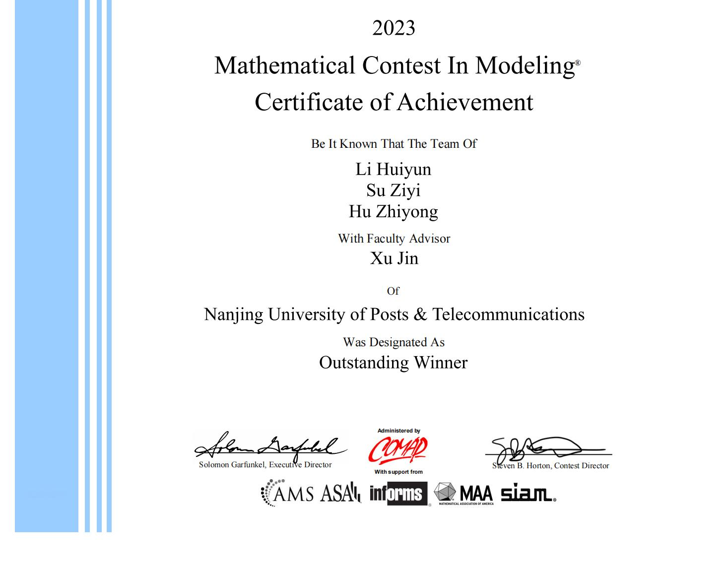 2023 年美国大学生数学建模竞赛和跨学科建模竞赛结果今日公布,全球有21858 个队参加了本届竞赛,共评出特等奖(Outstanding Winner)37 项,我校金栩老师和叶军老师指导的队各获 1 项特等奖(Outstanding Winner),闫冬雪老师指导的队获 AMS Award(美国数学学会奖),这是我校首次同时获得两个特等奖(Outstanding Winner)及首次获得 AMS Award(美国数学学会奖),竞赛成绩取得新的突破,我校获特等奖数量并列(与上海交通大学、天津大学)全国第四名,位列江苏省第一名(江苏高校一共获得三个特等奖)。另外,我校学生还获得特等奖提名奖(Finalist)15 项、一等奖(Meritorious Winner)44 项、二等奖(Honorable Mention)109 项,各奖项的获奖数量均创历史新高。