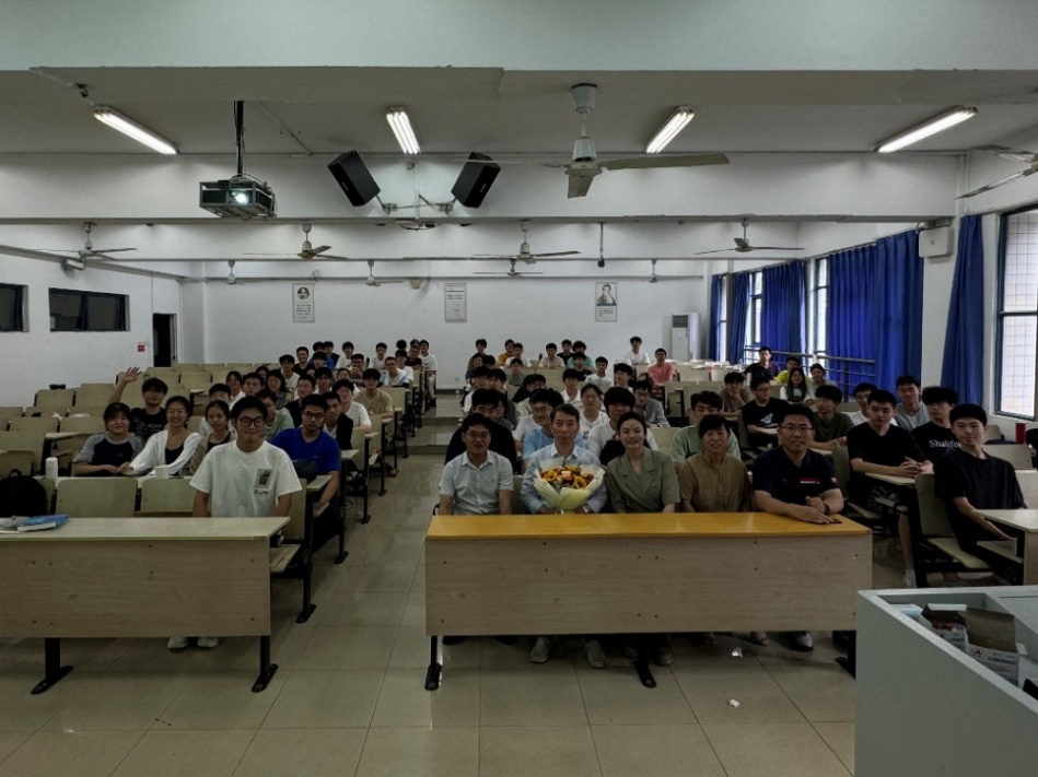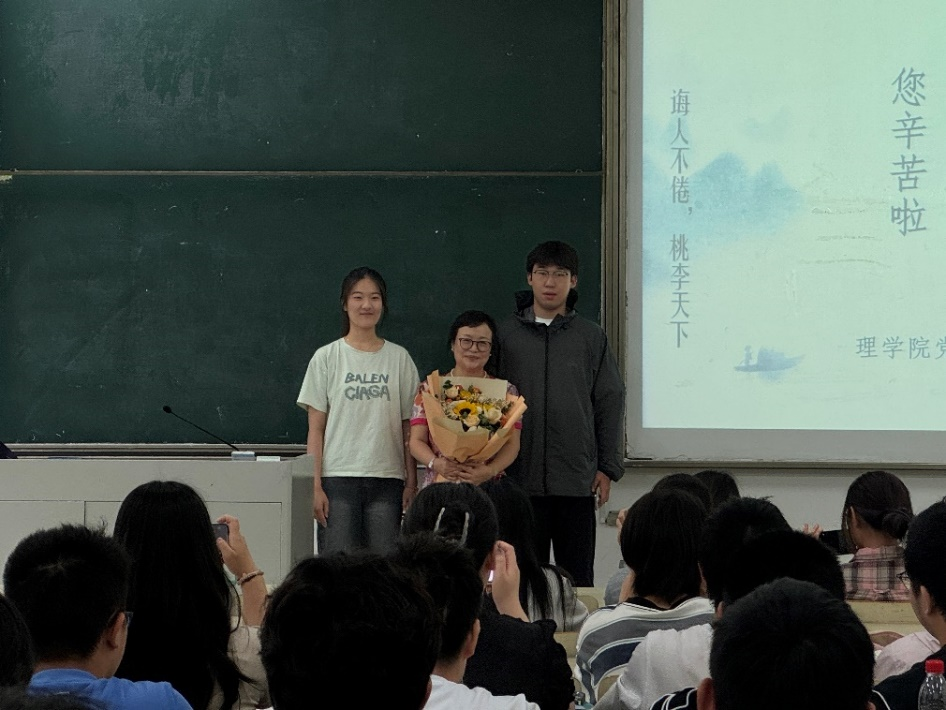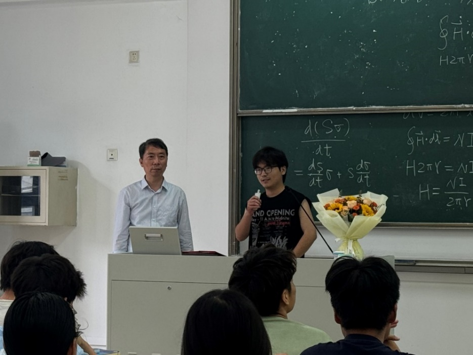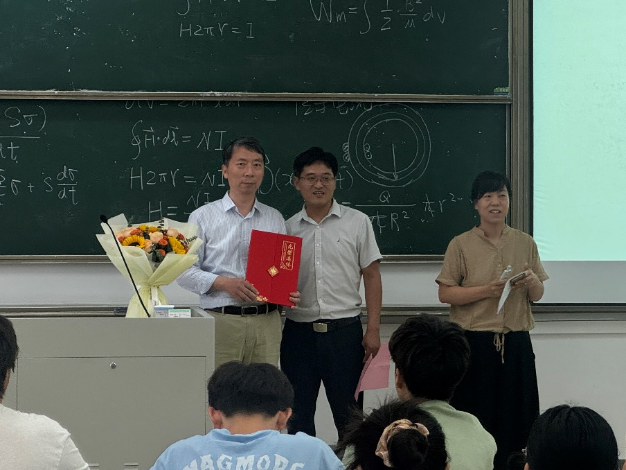 随着本学期《大学物理》最后一次课下课铃声响起,应用物理系教师代表翁亚奎手捧鲜花走进教室,为彭永刚老师献花并送上祝福,彭老师的荣休仪式由应用物理系主任王海云主持。
