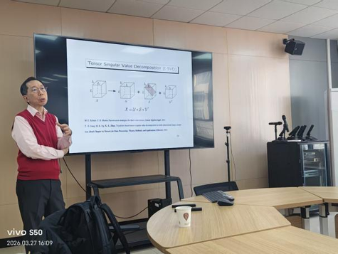 报告聚焦高维张量的分解方法及其在数据科学领域的应用,系统梳理了张量分解技术的前沿研究成果与实践应用路径,逻辑严谨、内容详实。报告伊始,吴国宝教授以经典张量分解理论为切入点,详细介绍了CP分解与Tucker分解的核心原理,明确指出CP分解是Tucker分解的特殊形式,为在场师生搭建了清晰的理论认知框架。随后,他进一步深入讲解了张量链分解、张量环分解及张量网络分解三种前沿方法,结合具体理论推导,阐释了各类方法在刻画核心张量间内在相关性、提升数据处理效率方面的独特优势。在张量奇异值分解(t-SVD)专题环节,吴教授创新性地介绍了基于卷积运算的张量内积定义,系统拆解了借助傅里叶变换实现t-SVD高效计算的关键步骤,并通过实际案例,直观展示了该方法在低秩张量近似、张量补全等场景中的应用价值,让抽象的数学理论变得通俗易懂。
